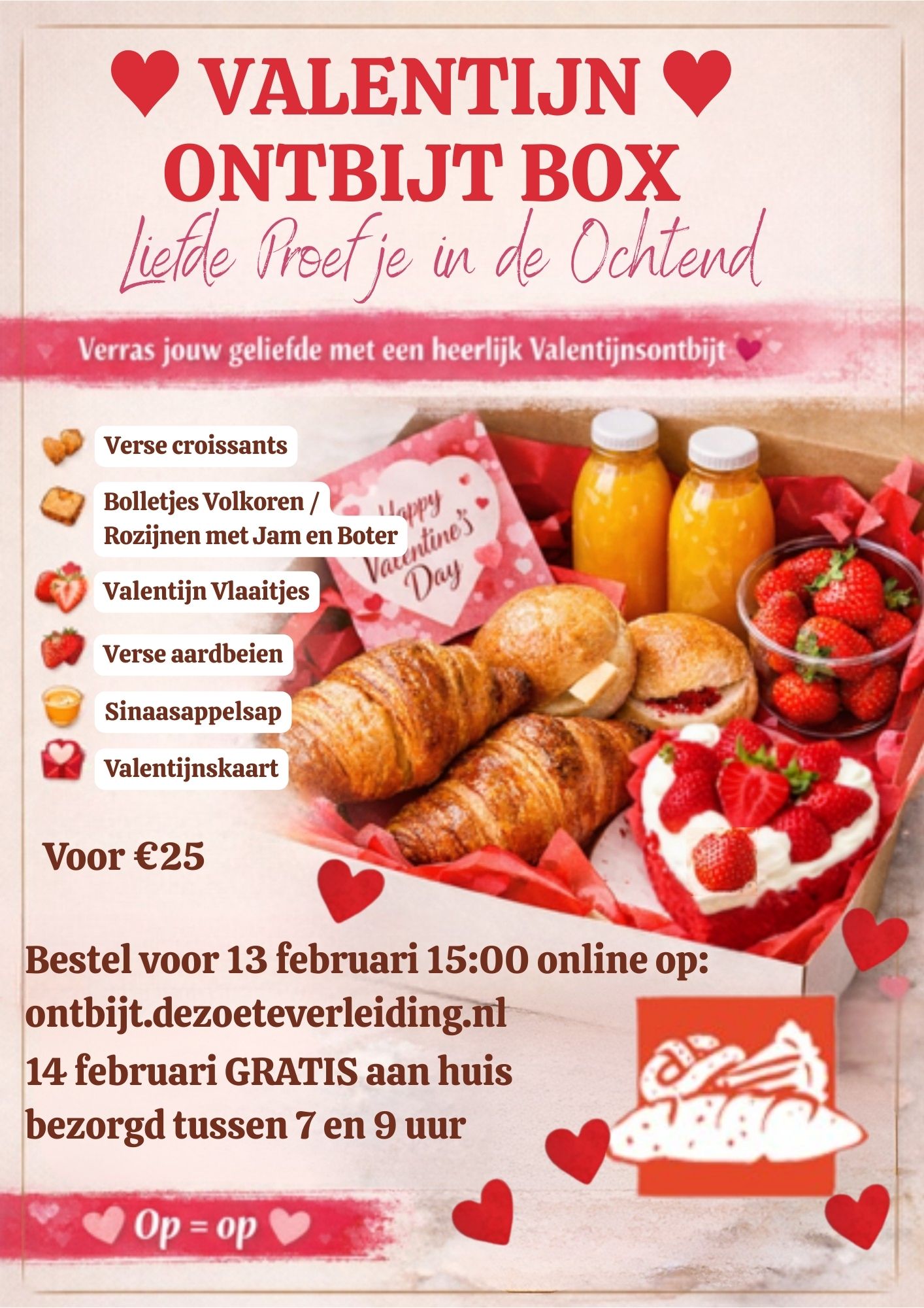 Verse croissants, sinaasappelsap luxe broodjes, hart taartjes, Valentijnskaart